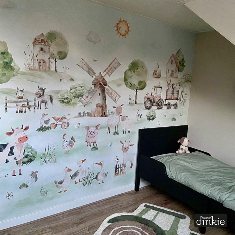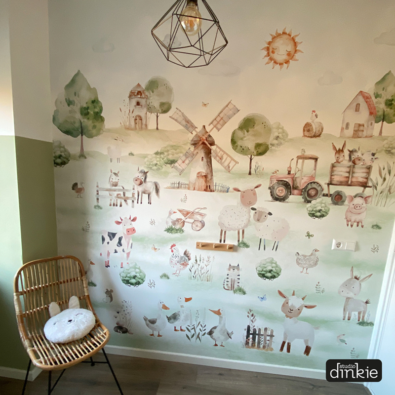 Ons gave boederij behang tovert jouw kinderkamer om tot een echte boerderij en zorgt voor een natuurlijke sfeer in de kamer. Gecombineerd met boerderij dieren en veel groen is je kamer een heuze boerderij geworden.